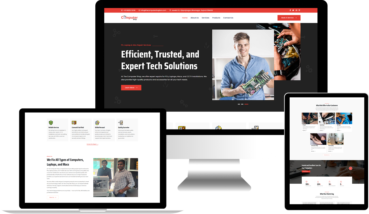 The Computer Shop is a simple and fast loading website developed for a computer retail and repair business. It provides information about available products, hardware repair services, and direct contact options for customers.
